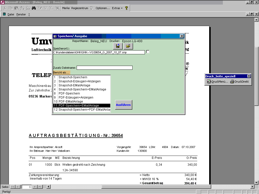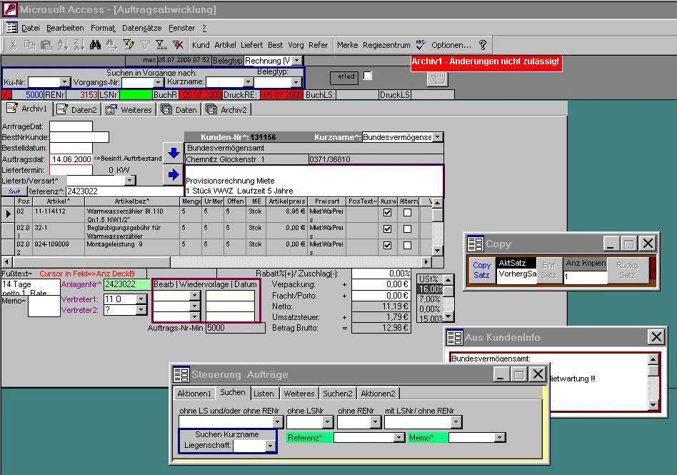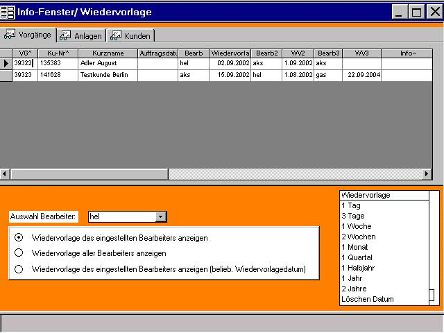 Übersicht und Zugriff auf externe Dateien in Referenzverwaltung In Referenzen navigiert das System automatisch in die passenden Ordner (Kunden- oder Anlagenordner). Damit schneller Zugriff (Doppelklick) damit auf alle Dokumente und andere beliebige Dateien (*.doc, *.xls, *.bmp, *.snp, *.pdf usw.) des Kunden bzw. der Anlage. Der Zugriff erfolgt bei großen Datenmengen wesentlich schneller als im Windows-Explorer. Wenn man alle Kundenordner mit diesen Snapshots/PDF (als fotografisches Abbild) auf einen Hieb auf CD brennt, hat man ein auf einen solides Beleg-Archiv aufgebaut. Außerdem kann man aus dem System komfortable Snapshots/PDF auch als Anhänge zu e-Mails verschicken. Stücklisten/ Produktion Strukturstückliste Wiedervorlage/ Erinnerungssystem bis 3 Mitarbeiter zuordenbar - Verantwortung, Aufgaben und Termine werden hier arbeitsteilig verwaltet Vorgangsarchiv |